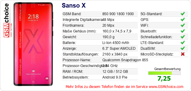 Hast du eigene Webseite? Willst du die Informationen über Standarddaten des Handys Sanso X irgendwo veröffentlichen? Das ist sehr einfach. Du kannst das Bild herunterladen oder kopieren und auf der Webseite folgenden Code hinzufügen:Das Einfügen von diesem Code verursacht das Anzeigen von dem folgenden Bild: