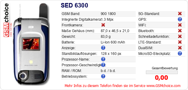 Hast du eigene Webseite? Willst du die Informationen über Standarddaten des Handys SED 6300 irgendwo veröffentlichen? Das ist sehr einfach. Du kannst das Bild herunterladen oder kopieren und auf der Webseite folgenden Code hinzufügen:Das Einfügen von diesem Code verursacht das Anzeigen von dem folgenden Bild:
