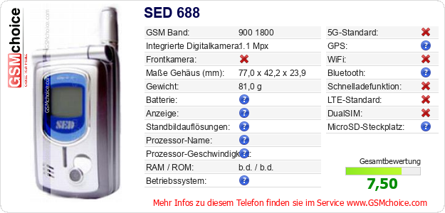Hast du eigene Webseite? Willst du die Informationen über Standarddaten des Handys SED 688 irgendwo veröffentlichen? Das ist sehr einfach. Du kannst das Bild herunterladen oder kopieren und auf der Webseite folgenden Code hinzufügen:Das Einfügen von diesem Code verursacht das Anzeigen von dem folgenden Bild:
