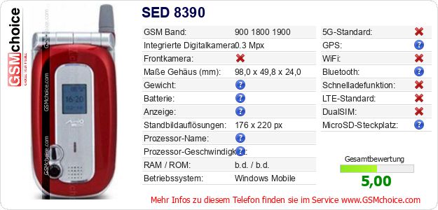 Hast du eigene Webseite? Willst du die Informationen über Standarddaten des Handys SED 8390 irgendwo veröffentlichen? Das ist sehr einfach. Du kannst das Bild herunterladen oder kopieren und auf der Webseite folgenden Code hinzufügen:Das Einfügen von diesem Code verursacht das Anzeigen von dem folgenden Bild:
