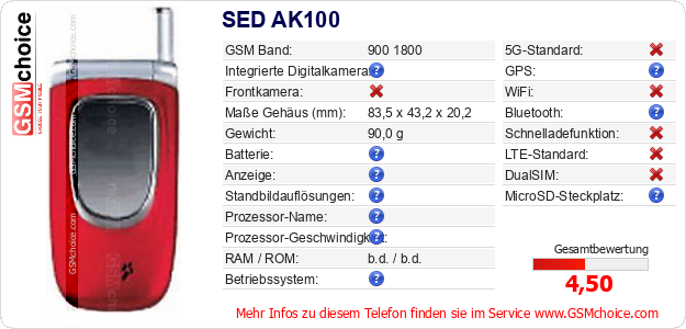 Hast du eigene Webseite? Willst du die Informationen über Standarddaten des Handys SED AK100 irgendwo veröffentlichen? Das ist sehr einfach. Du kannst das Bild herunterladen oder kopieren und auf der Webseite folgenden Code hinzufügen:Das Einfügen von diesem Code verursacht das Anzeigen von dem folgenden Bild: