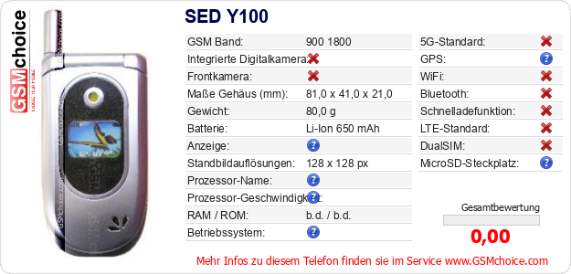 Hast du eigene Webseite? Willst du die Informationen über Standarddaten des Handys SED Y100 irgendwo veröffentlichen? Das ist sehr einfach. Du kannst das Bild herunterladen oder kopieren und auf der Webseite folgenden Code hinzufügen:Das Einfügen von diesem Code verursacht das Anzeigen von dem folgenden Bild: