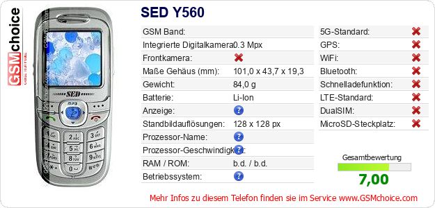 Hast du eigene Webseite? Willst du die Informationen über Standarddaten des Handys SED Y560 irgendwo veröffentlichen? Das ist sehr einfach. Du kannst das Bild herunterladen oder kopieren und auf der Webseite folgenden Code hinzufügen:Das Einfügen von diesem Code verursacht das Anzeigen von dem folgenden Bild: