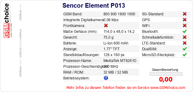 Daten des Mobiltelefons Sencor Element P013 auf Ihrer Seite