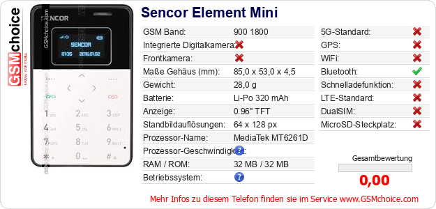 Hast du eigene Webseite? Willst du die Informationen über Standarddaten des Handys Sencor Element Mini irgendwo veröffentlichen? Das ist sehr einfach. Du kannst das Bild herunterladen oder kopieren und auf der Webseite folgenden Code hinzufügen:Das Einfügen von diesem Code verursacht das Anzeigen von dem folgenden Bild: