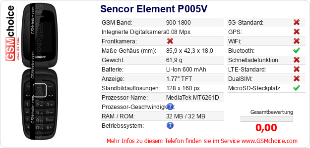 Daten des Mobiltelefons Sencor Element P005V auf Ihrer Seite