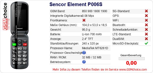 Daten des Mobiltelefons Sencor Element P006S auf Ihrer Seite