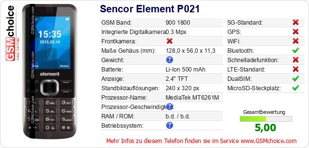 Hast du eigene Webseite? Willst du die Informationen über Standarddaten des Handys Sencor Element P021 irgendwo veröffentlichen? Das ist sehr einfach. Du kannst das Bild herunterladen oder kopieren und auf der Webseite folgenden Code hinzufügen:Das Einfügen von diesem Code verursacht das Anzeigen von dem folgenden Bild:
