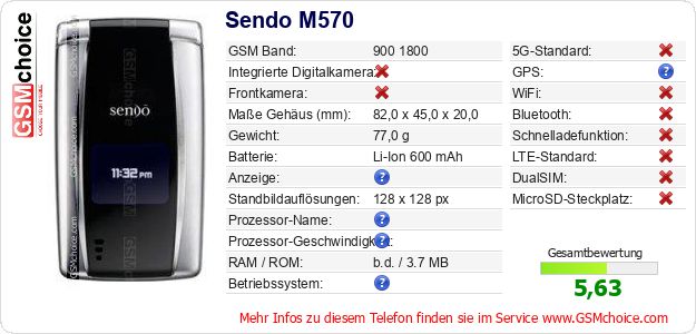 Hast du eigene Webseite? Willst du die Informationen über Standarddaten des Handys Sendo M570 irgendwo veröffentlichen? Das ist sehr einfach. Du kannst das Bild herunterladen oder kopieren und auf der Webseite folgenden Code hinzufügen:Das Einfügen von diesem Code verursacht das Anzeigen von dem folgenden Bild: