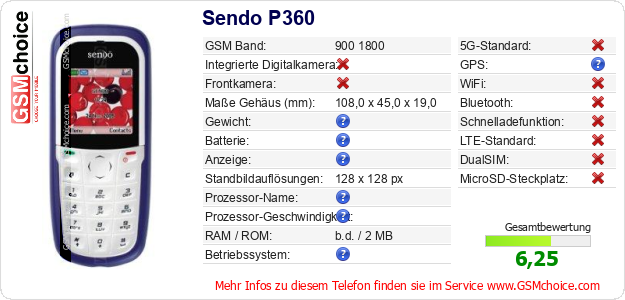 Hast du eigene Webseite? Willst du die Informationen über Standarddaten des Handys Sendo P360 irgendwo veröffentlichen? Das ist sehr einfach. Du kannst das Bild herunterladen oder kopieren und auf der Webseite folgenden Code hinzufügen:Das Einfügen von diesem Code verursacht das Anzeigen von dem folgenden Bild: