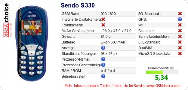 Hast du eigene Webseite? Willst du die Informationen über Standarddaten des Handys Sendo S330 irgendwo veröffentlichen? Das ist sehr einfach. Du kannst das Bild herunterladen oder kopieren und auf der Webseite folgenden Code hinzufügen:Das Einfügen von diesem Code verursacht das Anzeigen von dem folgenden Bild: