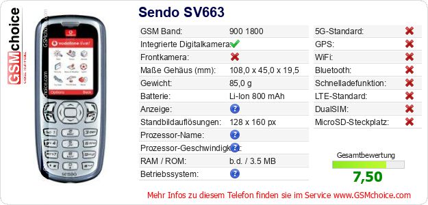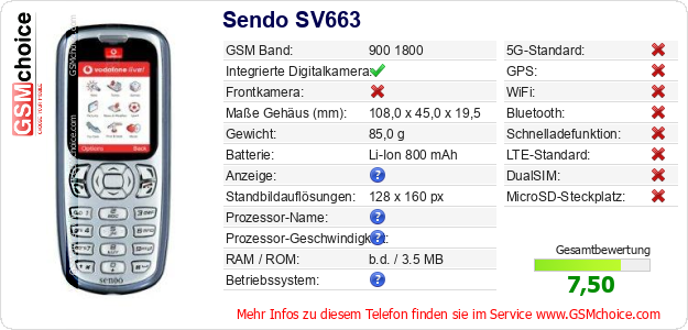 Hast du eigene Webseite? Willst du die Informationen über Standarddaten des Handys Sendo SV663 irgendwo veröffentlichen? Das ist sehr einfach. Du kannst das Bild herunterladen oder kopieren und auf der Webseite folgenden Code hinzufügen:Das Einfügen von diesem Code verursacht das Anzeigen von dem folgenden Bild: