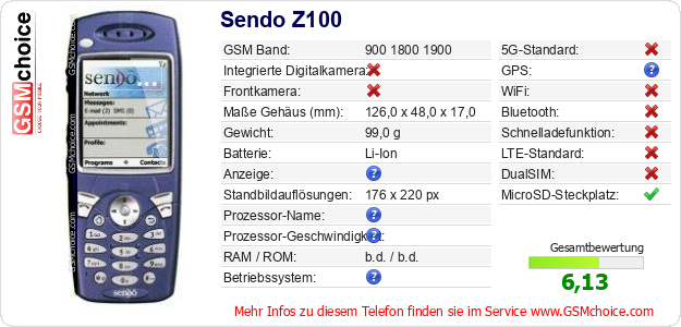 Hast du eigene Webseite? Willst du die Informationen über Standarddaten des Handys Sendo Z100 irgendwo veröffentlichen? Das ist sehr einfach. Du kannst das Bild herunterladen oder kopieren und auf der Webseite folgenden Code hinzufügen:Das Einfügen von diesem Code verursacht das Anzeigen von dem folgenden Bild: