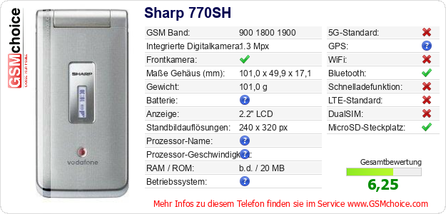 Hast du eigene Webseite? Willst du die Informationen über Standarddaten des Handys Sharp 770SH irgendwo veröffentlichen? Das ist sehr einfach. Du kannst das Bild herunterladen oder kopieren und auf der Webseite folgenden Code hinzufügen:Das Einfügen von diesem Code verursacht das Anzeigen von dem folgenden Bild: