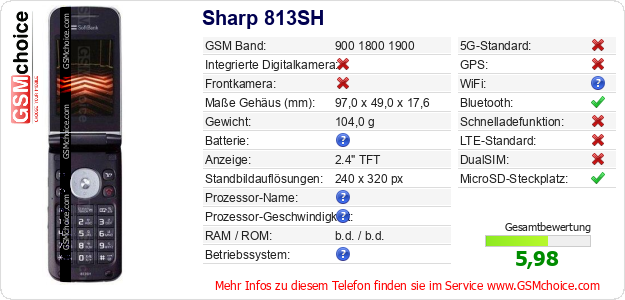 Hast du eigene Webseite? Willst du die Informationen über Standarddaten des Handys Sharp 813SH irgendwo veröffentlichen? Das ist sehr einfach. Du kannst das Bild herunterladen oder kopieren und auf der Webseite folgenden Code hinzufügen:Das Einfügen von diesem Code verursacht das Anzeigen von dem folgenden Bild: