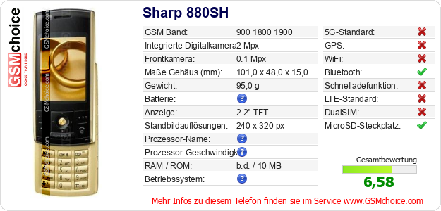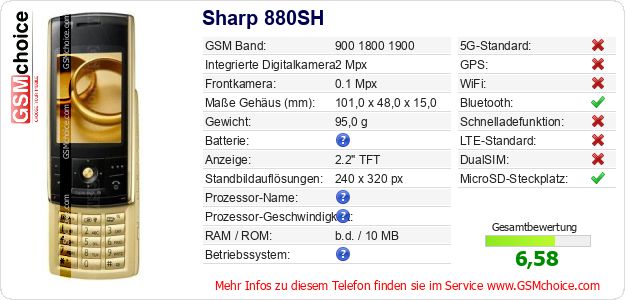 Hast du eigene Webseite? Willst du die Informationen über Standarddaten des Handys Sharp 880SH irgendwo veröffentlichen? Das ist sehr einfach. Du kannst das Bild herunterladen oder kopieren und auf der Webseite folgenden Code hinzufügen:Das Einfügen von diesem Code verursacht das Anzeigen von dem folgenden Bild: