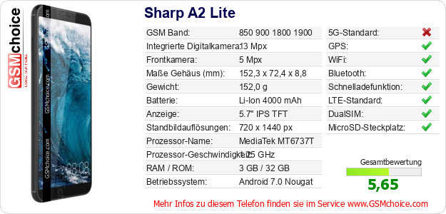 Hast du eigene Webseite? Willst du die Informationen über Standarddaten des Handys Sharp A2 Lite irgendwo veröffentlichen? Das ist sehr einfach. Du kannst das Bild herunterladen oder kopieren und auf der Webseite folgenden Code hinzufügen:Das Einfügen von diesem Code verursacht das Anzeigen von dem folgenden Bild: