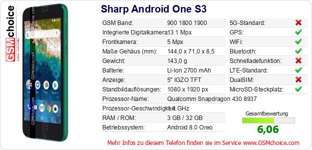 Hast du eigene Webseite? Willst du die Informationen über Standarddaten des Handys Sharp Android One S3 irgendwo veröffentlichen? Das ist sehr einfach. Du kannst das Bild herunterladen oder kopieren und auf der Webseite folgenden Code hinzufügen:Das Einfügen von diesem Code verursacht das Anzeigen von dem folgenden Bild: