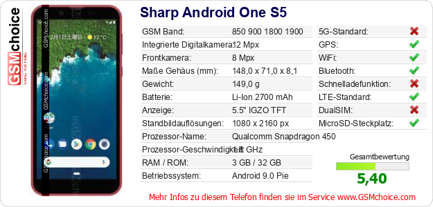 Hast du eigene Webseite? Willst du die Informationen über Standarddaten des Handys Sharp Android One S5 irgendwo veröffentlichen? Das ist sehr einfach. Du kannst das Bild herunterladen oder kopieren und auf der Webseite folgenden Code hinzufügen:Das Einfügen von diesem Code verursacht das Anzeigen von dem folgenden Bild:
