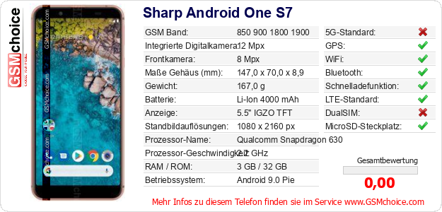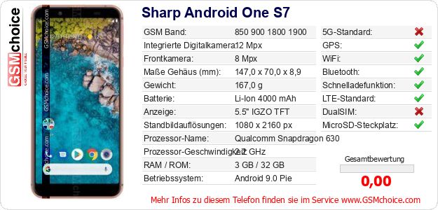 Hast du eigene Webseite? Willst du die Informationen über Standarddaten des Handys Sharp Android One S7 irgendwo veröffentlichen? Das ist sehr einfach. Du kannst das Bild herunterladen oder kopieren und auf der Webseite folgenden Code hinzufügen:Das Einfügen von diesem Code verursacht das Anzeigen von dem folgenden Bild: