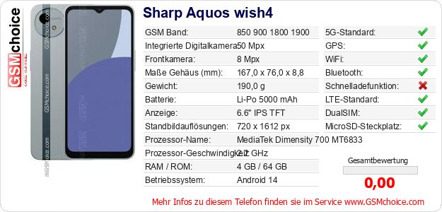 Hast du eigene Webseite? Willst du die Informationen über Standarddaten des Handys Sharp Aquos wish4 irgendwo veröffentlichen? Das ist sehr einfach. Du kannst das Bild herunterladen oder kopieren und auf der Webseite folgenden Code hinzufügen:Das Einfügen von diesem Code verursacht das Anzeigen von dem folgenden Bild: