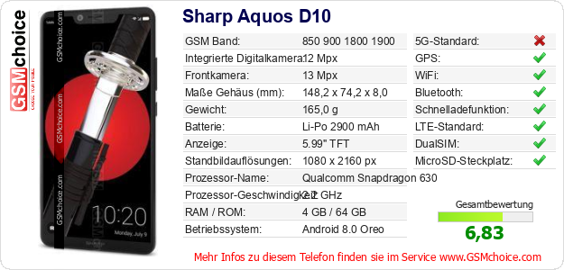 Hast du eigene Webseite? Willst du die Informationen über Standarddaten des Handys Sharp Aquos D10 irgendwo veröffentlichen? Das ist sehr einfach. Du kannst das Bild herunterladen oder kopieren und auf der Webseite folgenden Code hinzufügen:Das Einfügen von diesem Code verursacht das Anzeigen von dem folgenden Bild: