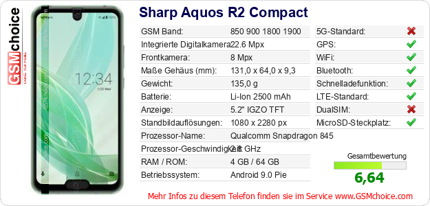 Daten des Mobiltelefons Sharp Aquos R2 Compact auf Ihrer Seite