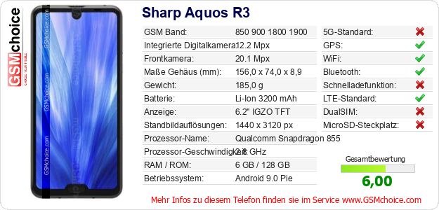 Hast du eigene Webseite? Willst du die Informationen über Standarddaten des Handys Sharp Aquos R3 irgendwo veröffentlichen? Das ist sehr einfach. Du kannst das Bild herunterladen oder kopieren und auf der Webseite folgenden Code hinzufügen:Das Einfügen von diesem Code verursacht das Anzeigen von dem folgenden Bild: