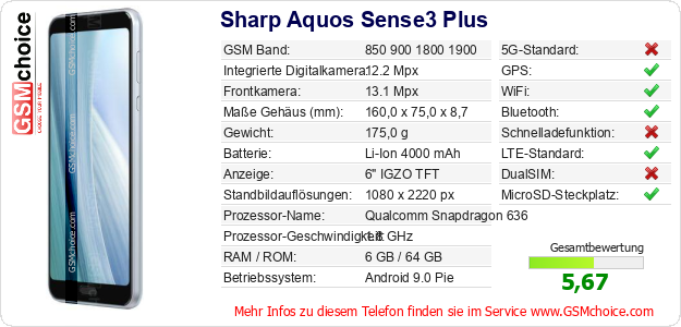 Hast du eigene Webseite? Willst du die Informationen über Standarddaten des Handys Sharp Aquos Sense3 Plus irgendwo veröffentlichen? Das ist sehr einfach. Du kannst das Bild herunterladen oder kopieren und auf der Webseite folgenden Code hinzufügen:Das Einfügen von diesem Code verursacht das Anzeigen von dem folgenden Bild: