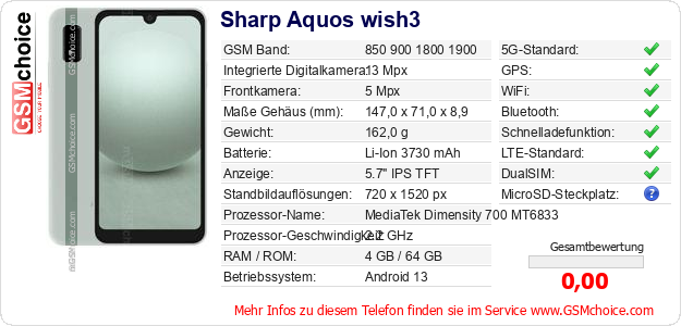 Hast du eigene Webseite? Willst du die Informationen über Standarddaten des Handys Sharp Aquos wish3 irgendwo veröffentlichen? Das ist sehr einfach. Du kannst das Bild herunterladen oder kopieren und auf der Webseite folgenden Code hinzufügen:Das Einfügen von diesem Code verursacht das Anzeigen von dem folgenden Bild: