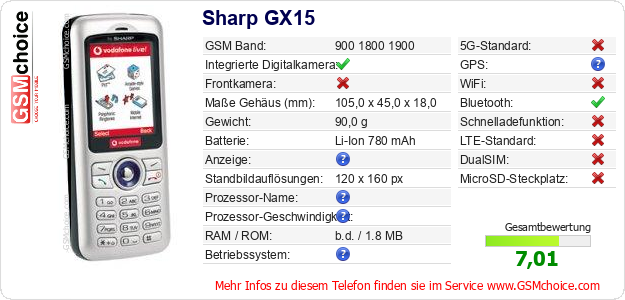 Hast du eigene Webseite? Willst du die Informationen über Standarddaten des Handys Sharp GX15 irgendwo veröffentlichen? Das ist sehr einfach. Du kannst das Bild herunterladen oder kopieren und auf der Webseite folgenden Code hinzufügen:Das Einfügen von diesem Code verursacht das Anzeigen von dem folgenden Bild: