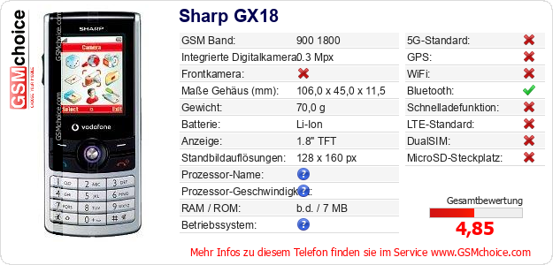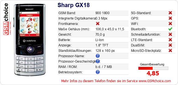 Hast du eigene Webseite? Willst du die Informationen über Standarddaten des Handys Sharp GX18 irgendwo veröffentlichen? Das ist sehr einfach. Du kannst das Bild herunterladen oder kopieren und auf der Webseite folgenden Code hinzufügen:Das Einfügen von diesem Code verursacht das Anzeigen von dem folgenden Bild: