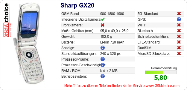 Hast du eigene Webseite? Willst du die Informationen über Standarddaten des Handys Sharp GX20 irgendwo veröffentlichen? Das ist sehr einfach. Du kannst das Bild herunterladen oder kopieren und auf der Webseite folgenden Code hinzufügen:Das Einfügen von diesem Code verursacht das Anzeigen von dem folgenden Bild: