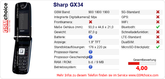 Hast du eigene Webseite? Willst du die Informationen über Standarddaten des Handys Sharp GX34 irgendwo veröffentlichen? Das ist sehr einfach. Du kannst das Bild herunterladen oder kopieren und auf der Webseite folgenden Code hinzufügen:Das Einfügen von diesem Code verursacht das Anzeigen von dem folgenden Bild: