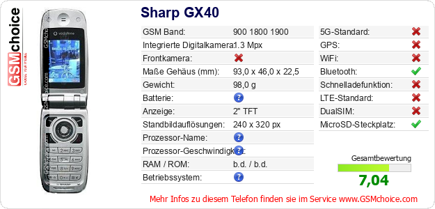 Hast du eigene Webseite? Willst du die Informationen über Standarddaten des Handys Sharp GX40 irgendwo veröffentlichen? Das ist sehr einfach. Du kannst das Bild herunterladen oder kopieren und auf der Webseite folgenden Code hinzufügen:Das Einfügen von diesem Code verursacht das Anzeigen von dem folgenden Bild: