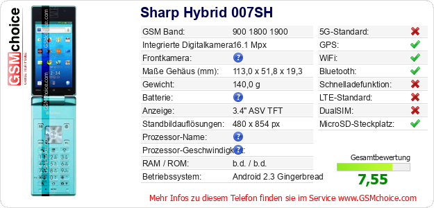 Hast du eigene Webseite? Willst du die Informationen über Standarddaten des Handys Sharp Hybrid 007SH irgendwo veröffentlichen? Das ist sehr einfach. Du kannst das Bild herunterladen oder kopieren und auf der Webseite folgenden Code hinzufügen:Das Einfügen von diesem Code verursacht das Anzeigen von dem folgenden Bild: