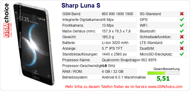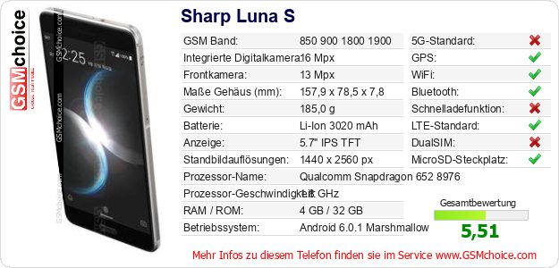 Hast du eigene Webseite? Willst du die Informationen über Standarddaten des Handys Sharp Luna S irgendwo veröffentlichen? Das ist sehr einfach. Du kannst das Bild herunterladen oder kopieren und auf der Webseite folgenden Code hinzufügen:Das Einfügen von diesem Code verursacht das Anzeigen von dem folgenden Bild: