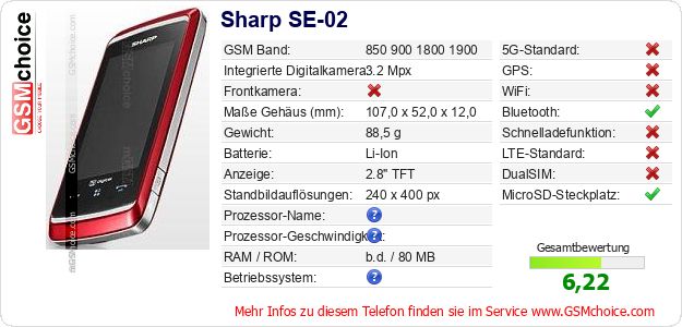 Hast du eigene Webseite? Willst du die Informationen über Standarddaten des Handys Sharp SE-02 irgendwo veröffentlichen? Das ist sehr einfach. Du kannst das Bild herunterladen oder kopieren und auf der Webseite folgenden Code hinzufügen:Das Einfügen von diesem Code verursacht das Anzeigen von dem folgenden Bild: