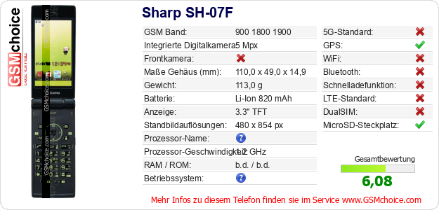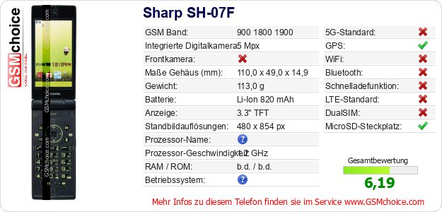 Hast du eigene Webseite? Willst du die Informationen über Standarddaten des Handys Sharp SH-07F irgendwo veröffentlichen? Das ist sehr einfach. Du kannst das Bild herunterladen oder kopieren und auf der Webseite folgenden Code hinzufügen:Das Einfügen von diesem Code verursacht das Anzeigen von dem folgenden Bild: