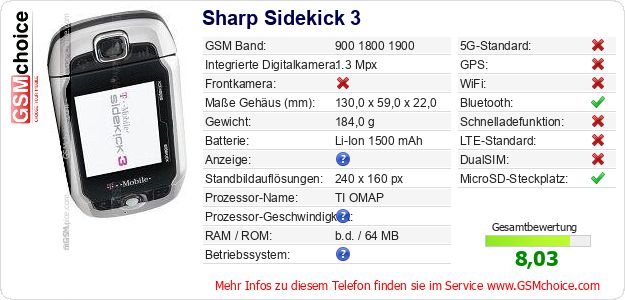 Hast du eigene Webseite? Willst du die Informationen über Standarddaten des Handys Sharp Sidekick 3 irgendwo veröffentlichen? Das ist sehr einfach. Du kannst das Bild herunterladen oder kopieren und auf der Webseite folgenden Code hinzufügen:Das Einfügen von diesem Code verursacht das Anzeigen von dem folgenden Bild: