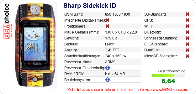 Hast du eigene Webseite? Willst du die Informationen über Standarddaten des Handys Sharp Sidekick iD irgendwo veröffentlichen? Das ist sehr einfach. Du kannst das Bild herunterladen oder kopieren und auf der Webseite folgenden Code hinzufügen:Das Einfügen von diesem Code verursacht das Anzeigen von dem folgenden Bild: