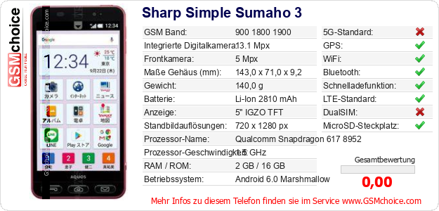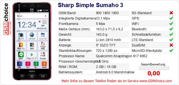 Hast du eigene Webseite? Willst du die Informationen über Standarddaten des Handys Sharp Simple Sumaho 3 irgendwo veröffentlichen? Das ist sehr einfach. Du kannst das Bild herunterladen oder kopieren und auf der Webseite folgenden Code hinzufügen:Das Einfügen von diesem Code verursacht das Anzeigen von dem folgenden Bild:
