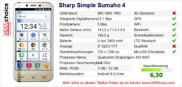 Hast du eigene Webseite? Willst du die Informationen über Standarddaten des Handys Sharp Simple Sumaho 4 irgendwo veröffentlichen? Das ist sehr einfach. Du kannst das Bild herunterladen oder kopieren und auf der Webseite folgenden Code hinzufügen:Das Einfügen von diesem Code verursacht das Anzeigen von dem folgenden Bild: