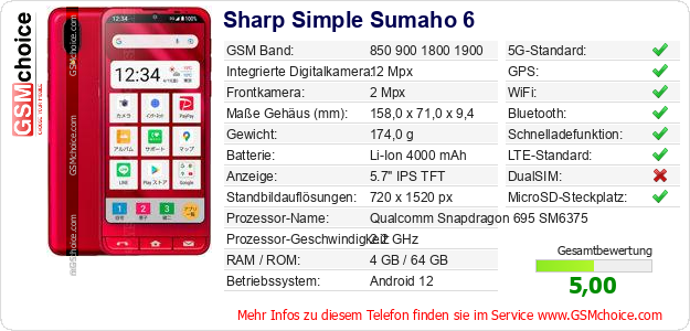 Hast du eigene Webseite? Willst du die Informationen über Standarddaten des Handys Sharp Simple Sumaho 6 irgendwo veröffentlichen? Das ist sehr einfach. Du kannst das Bild herunterladen oder kopieren und auf der Webseite folgenden Code hinzufügen:Das Einfügen von diesem Code verursacht das Anzeigen von dem folgenden Bild:
