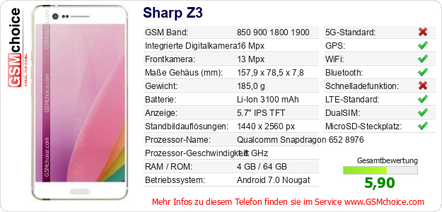 Hast du eigene Webseite? Willst du die Informationen über Standarddaten des Handys Sharp Z3 irgendwo veröffentlichen? Das ist sehr einfach. Du kannst das Bild herunterladen oder kopieren und auf der Webseite folgenden Code hinzufügen:Das Einfügen von diesem Code verursacht das Anzeigen von dem folgenden Bild: