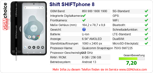 Hast du eigene Webseite? Willst du die Informationen über Standarddaten des Handys Shift SHIFTphone 8 irgendwo veröffentlichen? Das ist sehr einfach. Du kannst das Bild herunterladen oder kopieren und auf der Webseite folgenden Code hinzufügen:Das Einfügen von diesem Code verursacht das Anzeigen von dem folgenden Bild: