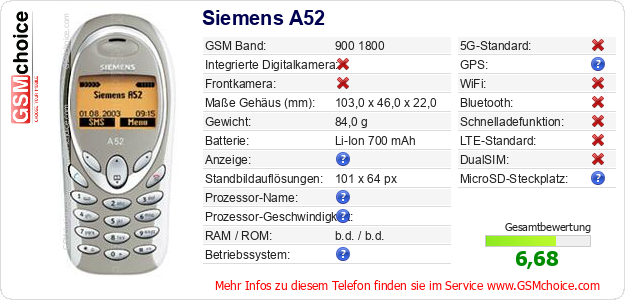 Hast du eigene Webseite? Willst du die Informationen über Standarddaten des Handys Siemens A52 irgendwo veröffentlichen? Das ist sehr einfach. Du kannst das Bild herunterladen oder kopieren und auf der Webseite folgenden Code hinzufügen:Das Einfügen von diesem Code verursacht das Anzeigen von dem folgenden Bild: