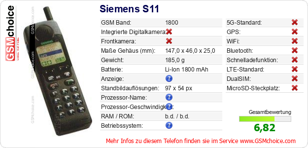 Hast du eigene Webseite? Willst du die Informationen über Standarddaten des Handys Siemens S11 irgendwo veröffentlichen? Das ist sehr einfach. Du kannst das Bild herunterladen oder kopieren und auf der Webseite folgenden Code hinzufügen:Das Einfügen von diesem Code verursacht das Anzeigen von dem folgenden Bild: