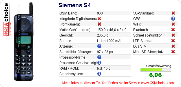 Hast du eigene Webseite? Willst du die Informationen über Standarddaten des Handys Siemens S4 irgendwo veröffentlichen? Das ist sehr einfach. Du kannst das Bild herunterladen oder kopieren und auf der Webseite folgenden Code hinzufügen:Das Einfügen von diesem Code verursacht das Anzeigen von dem folgenden Bild: