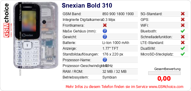 Hast du eigene Webseite? Willst du die Informationen über Standarddaten des Handys Snexian Bold 310 irgendwo veröffentlichen? Das ist sehr einfach. Du kannst das Bild herunterladen oder kopieren und auf der Webseite folgenden Code hinzufügen:Das Einfügen von diesem Code verursacht das Anzeigen von dem folgenden Bild: